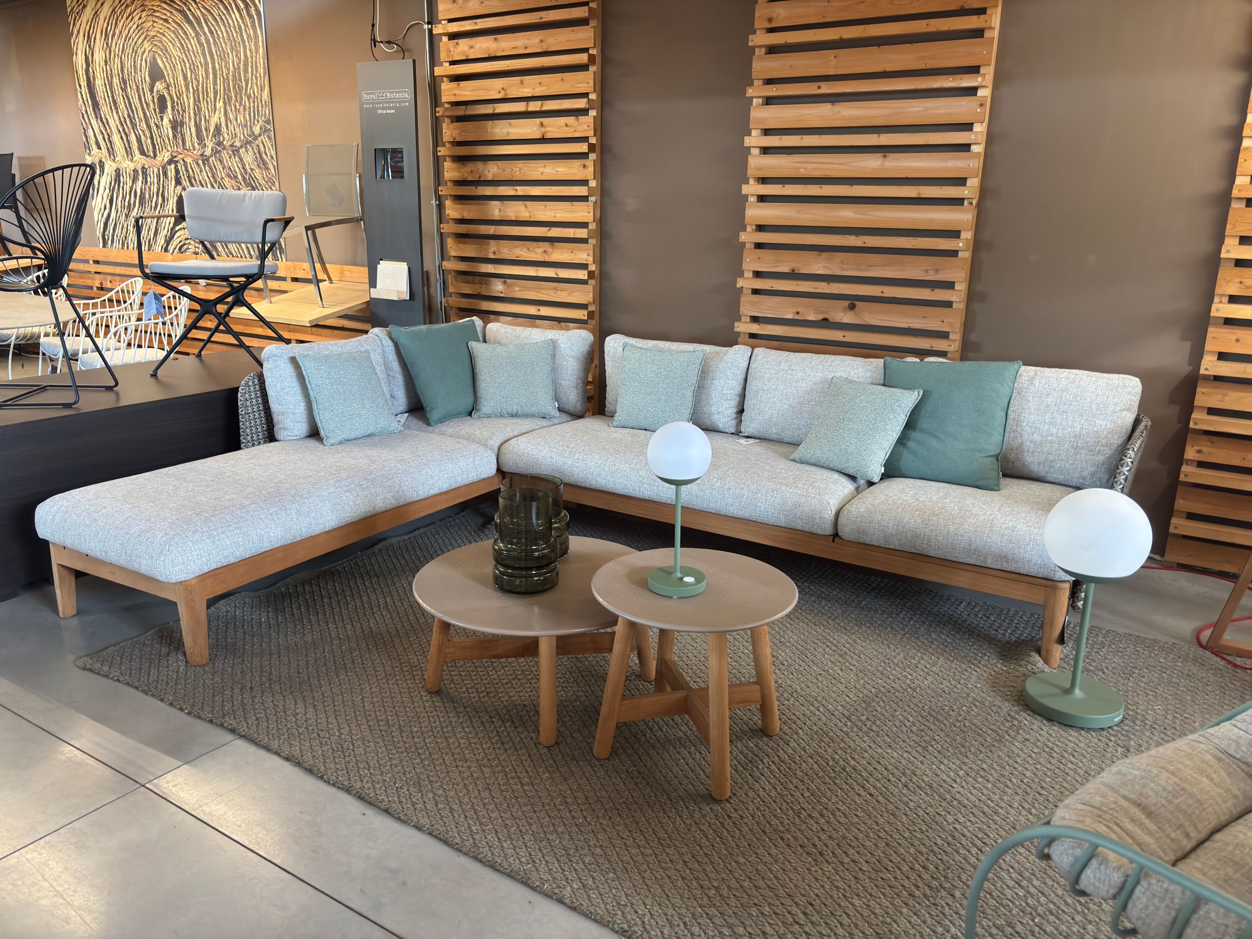 Composizione outdoor che unisce il divano angolare Calypso di Royal Botania, con struttura in teak massello e seduta generosa, ai tavolini Mbrace di Dedon, coordinati per materiali e stile. L’abbinamento garantisce coerenza formale, resistenza agli agenti atmosferici e funzionalità, ideale per ambienti esterni di alto profilo.