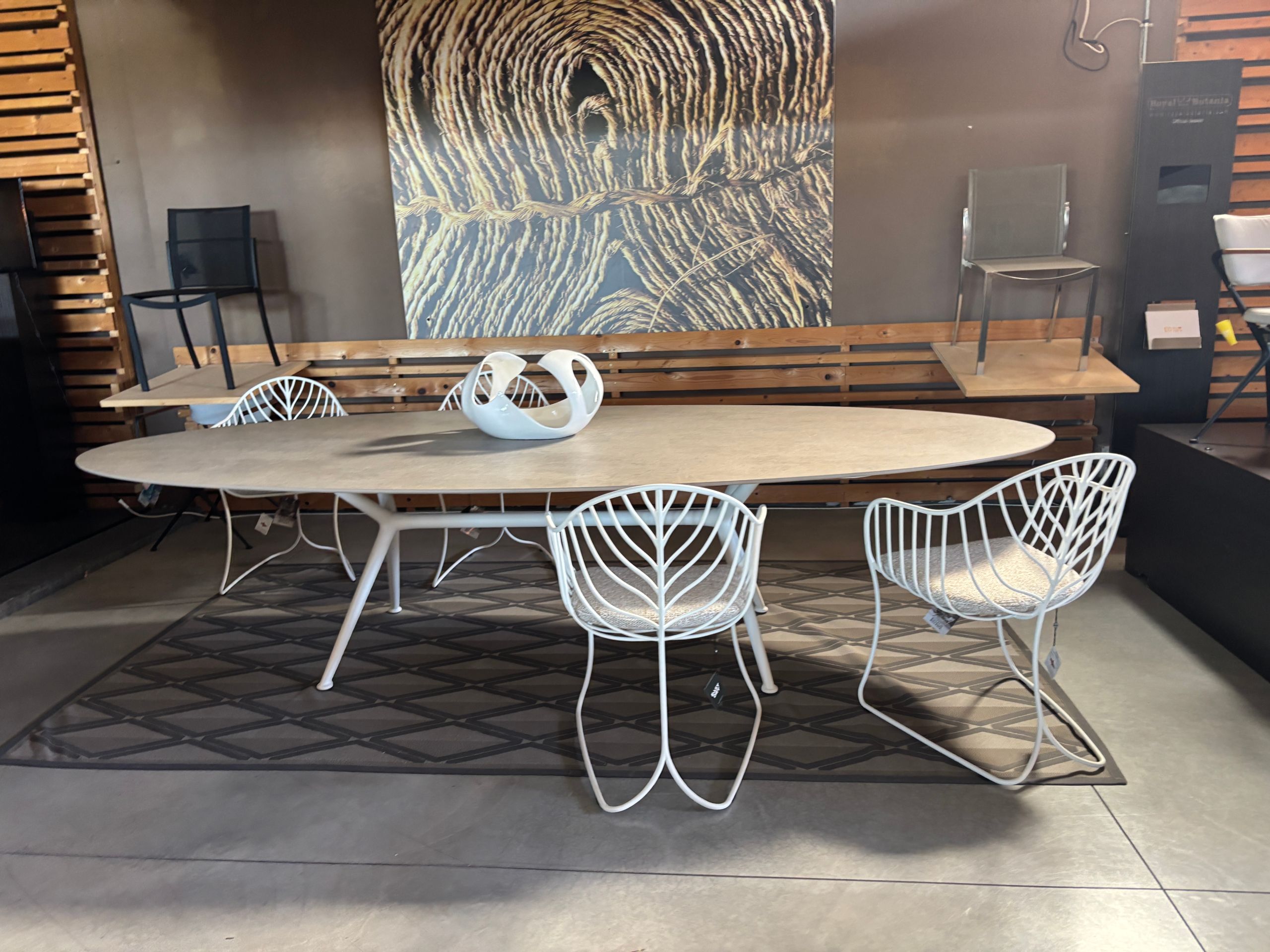 Il tavolo Exes per esterno è un elemento d’arredo pensato per spazi outdoor importanti. Il suo piano in ceramica assicura eleganza, resistenza e facilità di manutenzione, mentre la base in alluminio unisce leggerezza strutturale e robustezza. Ad accompagnarlo, 8 poltroncine Folia, vere e proprie icone di design, si distinguono per la loro forma avvolgente e scultorea. Realizzate con una struttura in alluminio e un’estetica raffinata, sono dotate di cuscino incluso per il massimo comfort. L'equilibrio tra forma e funzione rende questo insieme un'eccellenza nel mondo dell'arredo outdoor di alta gamma.