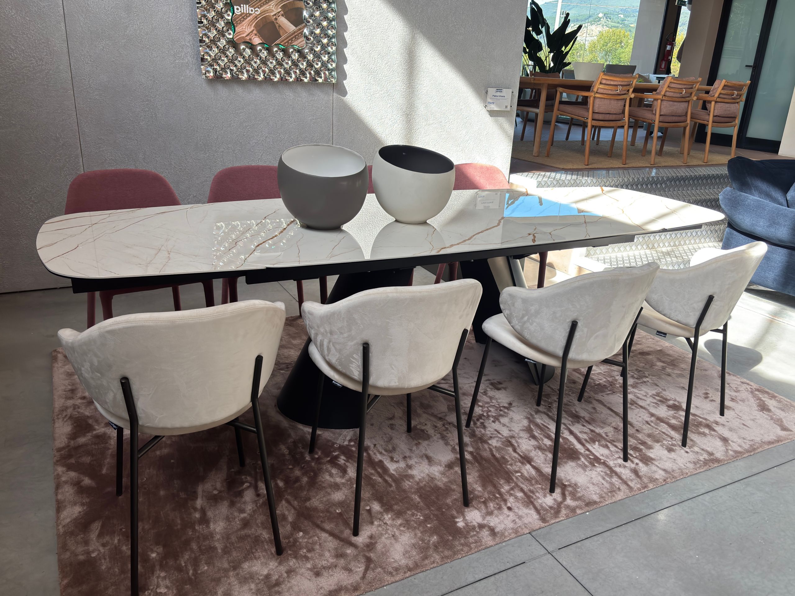 Il tavolo Apian con le sue proporzioni eleganti è l'espressione di un approccio progettuale attento all'architettura del progetto e alla sua realizzazione con materiali accuratamente lavorati. La leggerezza del suo aspetto si ispira al tema del foglio di metallo che si incurva e si inclina disegnandone la base caratterizzata da un segno netto e deciso su cui si poggia il piano con un meccanismo di allunga manuale: due allunghe laterali permettono ad Apian di raggiungere i 3 metri di lunghezza. Top in ceramica effetto marmo lucido Statuario Oro, basamento in metallo nei colori bronzo e nero.
