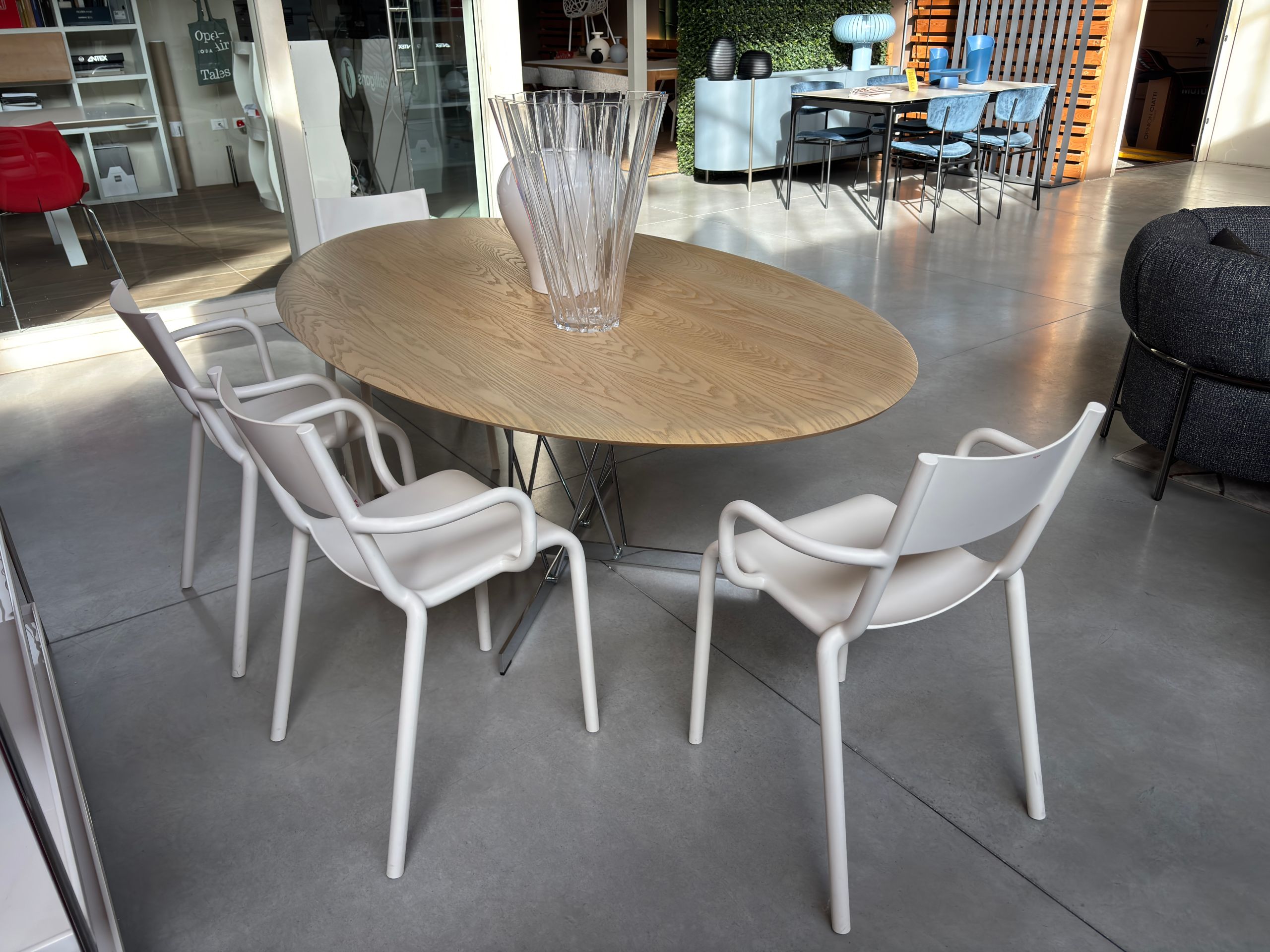 Tavolo da pranzo ovale firmato da Philippe Starck. Basamento in acciaio cromato e piano in frassino ciaro con lavorazione a saponetta.